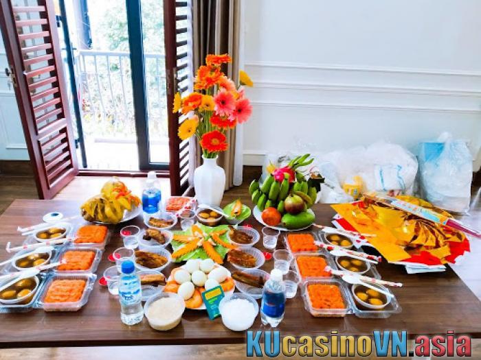 Ở một số vùng, những vùng khác, đồ cúng có thể thay đổi và tùy thuộc vào các buổi thờ cúng được tổ chức trong cả tháng. Trong một ngày cho cả tháng, gia chủ có thể chuẩn bị một mâm cúng để tưởng nhớ 12 người mẹ, gồm 12 chén chè và 3 bát chè, 3 bát cháo, 3 đĩa gạo nếp và một con vịt luộc buộc dây. cánh. Kính cáo tam sư.