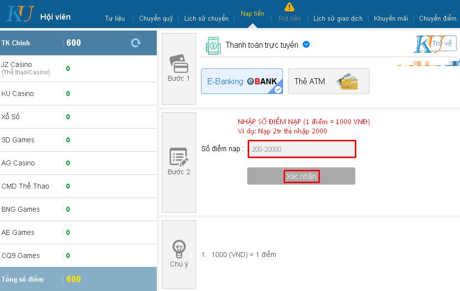 Bước 2: Chọn mục E-Banking, nhập vào Số Điểm phải Nạp và bấm Xác Nhận (1 điểm = 1000 VNĐ)
