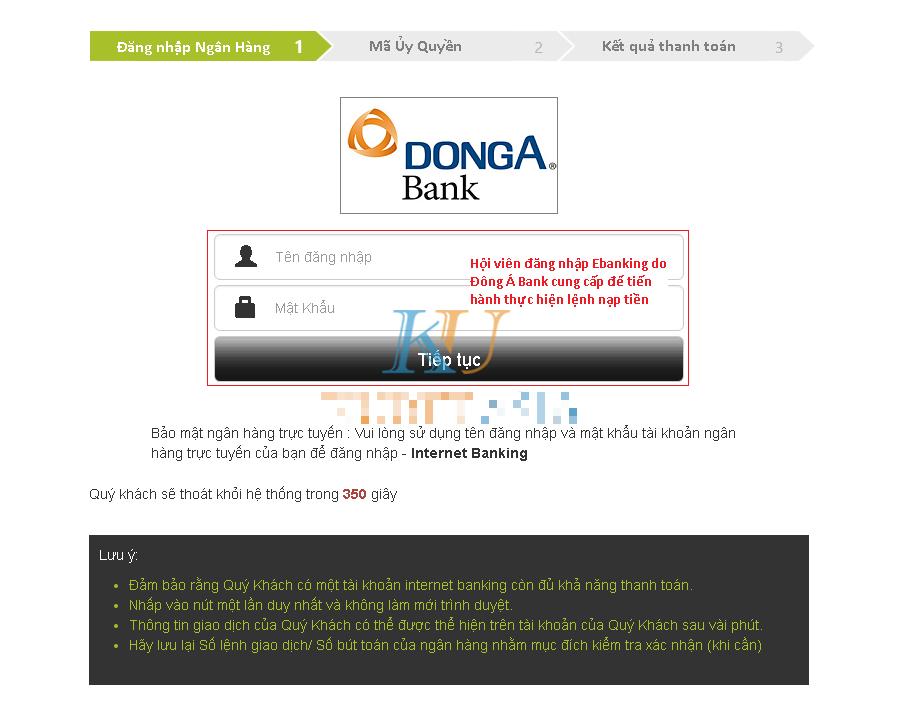Khi tiến hành gửi tiền KU theo những phương thức sau đây. Người chơi buộc phải với đăng ký internet banking cho tài khoản Đông Á của mình. Chi tiết phương pháp nạp tiền ra sao mời xem những hình ảnh chỉ dẫn phía dưới đây