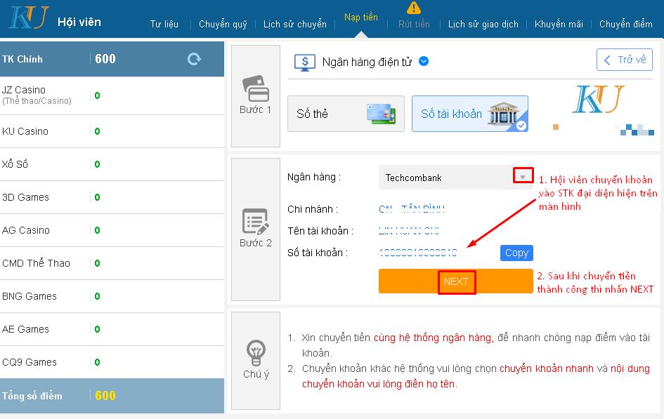 Ở phương thức này, người chơi sẽ chuyển khoản liên nhà băng qua số account đại diện của Techcombank, cụ thể như sau: