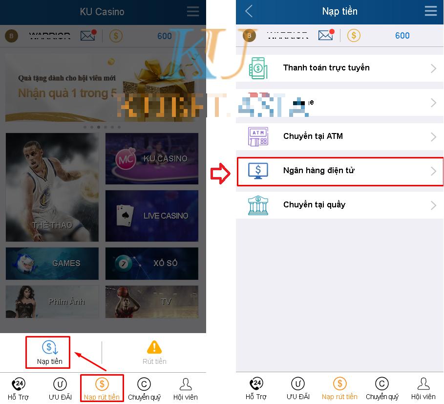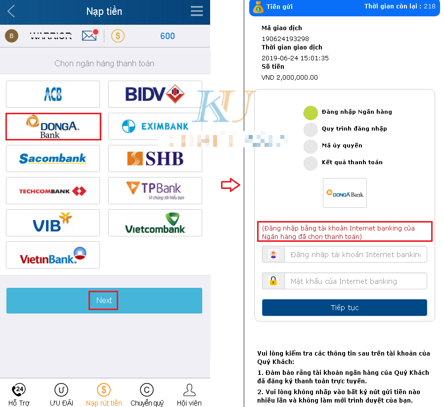 Nạp tiền Kubet từ ngân hàng Đông Á Bank trên Mobile tại Ku casino
