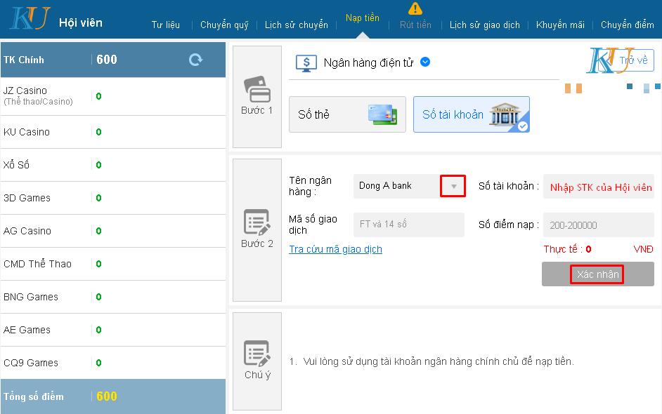 Nạp tiền Kubet từ ngân hàng Đông Á giao diện máy tính tại Ku casino