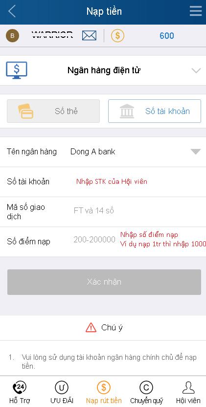 Bước 3: Sau khi chuyển khoản thành công mới điền tiếp theo cái ở dưới. (1 điểm = 1.000 vnđ)