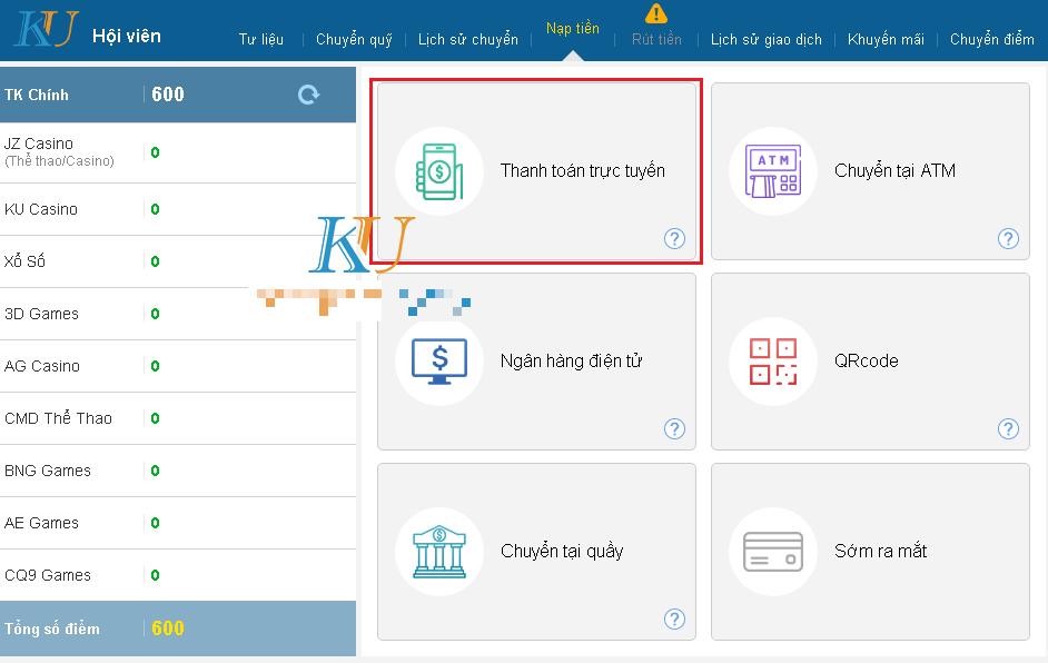 Bước 1: Nhấn vào chỗ nạp rút, tậu nạp tiền – sắm phương thức “Thanh Toán Trực Tuyến”