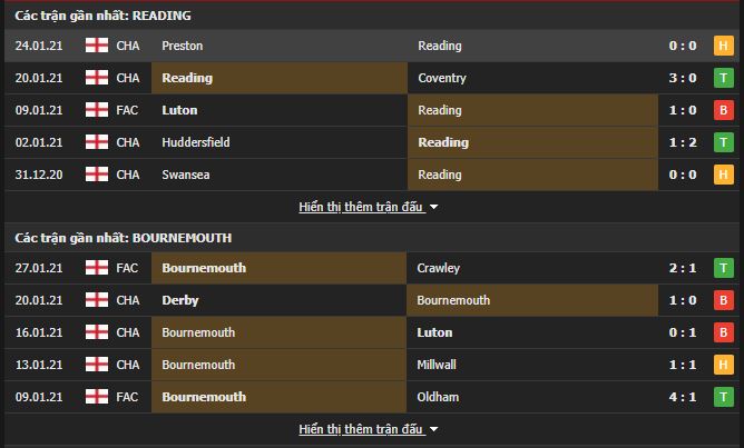 Phong độ gần đây nhất của Reading VS Bournemouth: