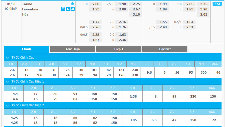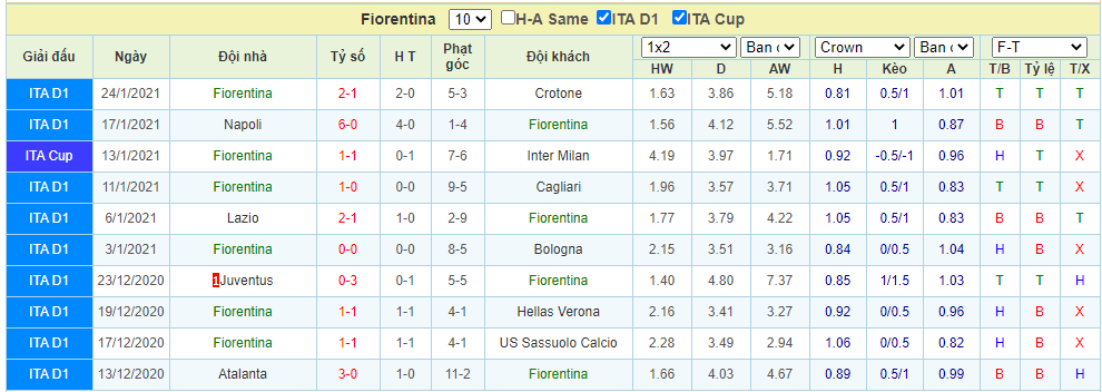Kèo châu Á, chấp Torino FC cho ACF Fiorentina